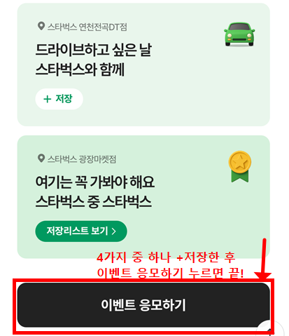 | 참여 방법 | 네이버 지도 앱에서 스타벅스 저장 리스트 4개 중 1개 이상 저장 후 응모 |