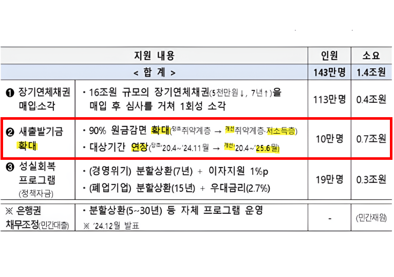 - 특히 중위소득 60% 기준은 '새출발기금 감면'뿐만 아니라, '장기연체채권 매입·소각 프로그램'에서도 핵심 조건으로 적용됩니다.