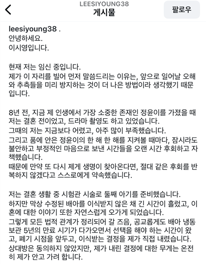 이시영은 “상대방(전남편)이 동의하지 않았다. 하지만 그 무게는 내가 온전히 안고 가겠다”며